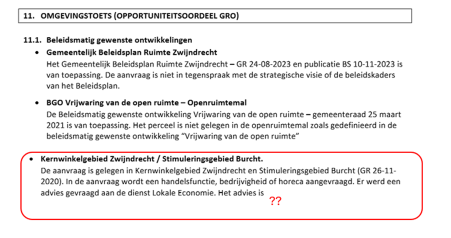 De wijze waarop vandaag bij de vergunningverlening wordt omgegaan met beleidsprincipes, regelgeving en expertenadviezen, roept evenwel vragen op. Met betrekking tot het kernwinkelgebied Zwijndrecht gaat het om 3 dossiers.